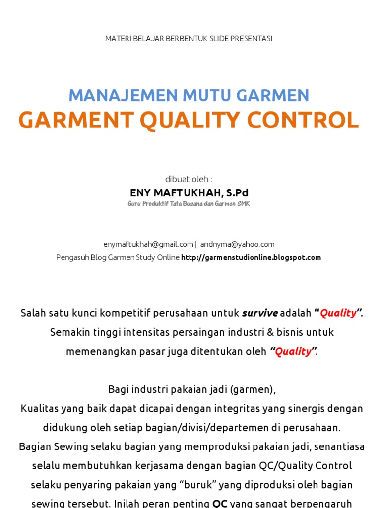 How to use 4 point system in fabric inspection? Cara menghitung biaya produksi per unit menggunakan metode tradisional (konvensional) dan metode abc (activity based costing). 21.controlling area includes only one company code in the same controlling. Berikut beberapa contoh soal tes beserta jawabannya sebagai referensi buat teman teman sekalian yang akan melamar. Soal dan jawaban kewirausahaan prakarya smk x. Latihan soal tes pendamping desa 2017 forum guru indonesia. Apr 02, 2011 · salah satu metode quality yang erat kaitannya dengan hal tersebut adalah statistical process control (spc). Kumpulan contoh soal sertifikasi sap fundamental. Contoh soal control chart for variables sesuai handbook quality improvement 9th edition by besterfield sebagai berikut : Quality costs and productivity measurement reporting and control. Mengenal dasar quality control tugas quality control adalah. Contoh soal tes quality control garment zona ilmu 5. Qc pada perusahaan sepenuhnya tergantung pada industri.